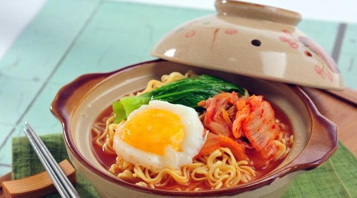 Siapkan mangkuk saji, masukkan mi ke dalamnya, tuang kuah dan susun di atasnya sawi, kimchi dan telur. Siap disajikan.