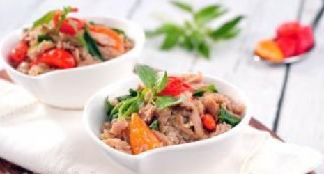 Tumis bawang bombai, bawang putih, jahe, dan cabai hingga harum. Tambahkan tuna, kecap manis, ketumbar, merica, dan garam, aduk rata.
